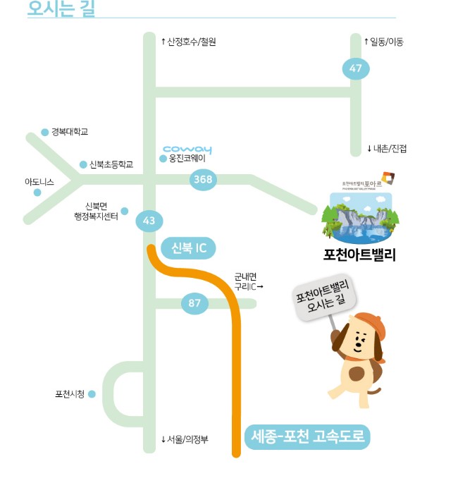 교통편: 서울에서 차로 약 1시간 30분 소요. 버스의 경우 포천터미널에서 138번 버스를 타고 아트밸리에서 하차 가능